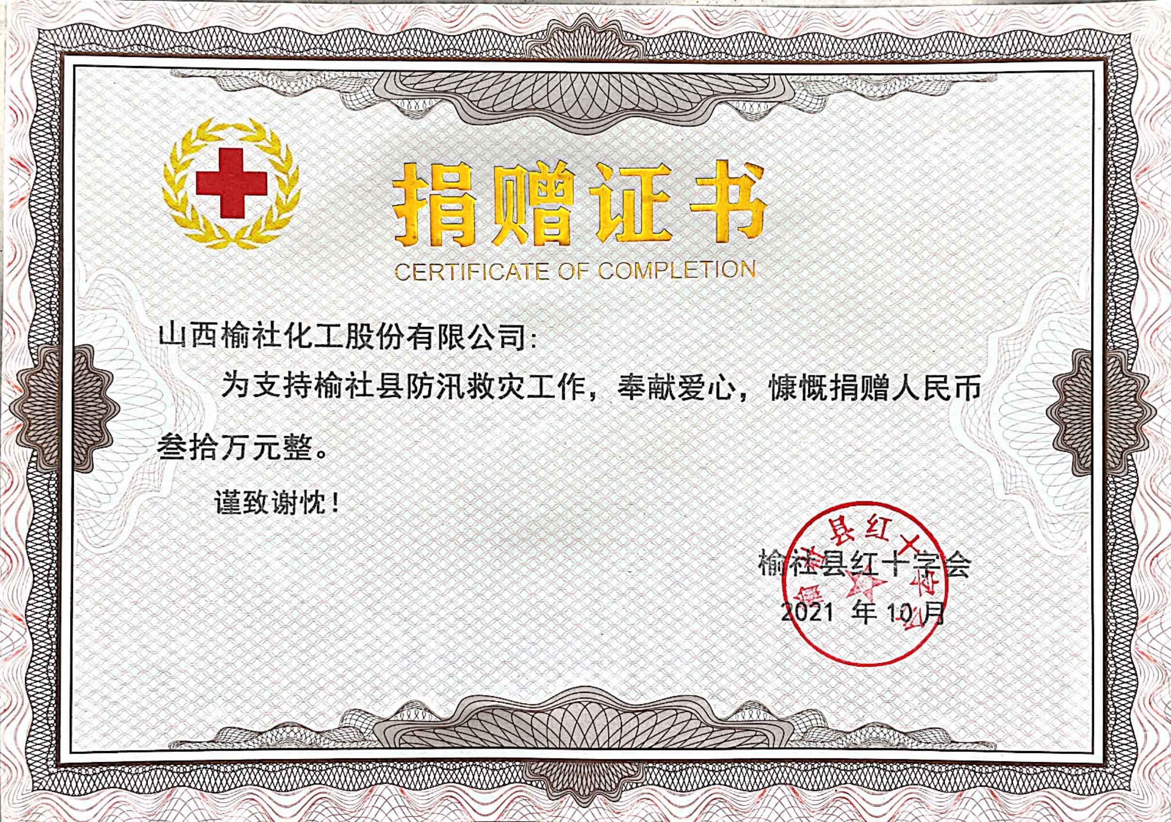 2021年榆社縣防汛救災(zāi)捐贈(zèng)證書