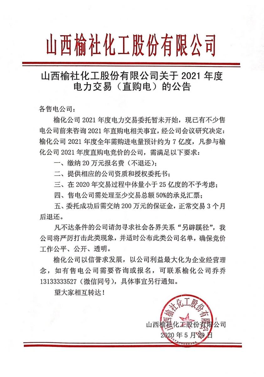 榆化公司關(guān)于2021年度電力交易(直購電)的公告