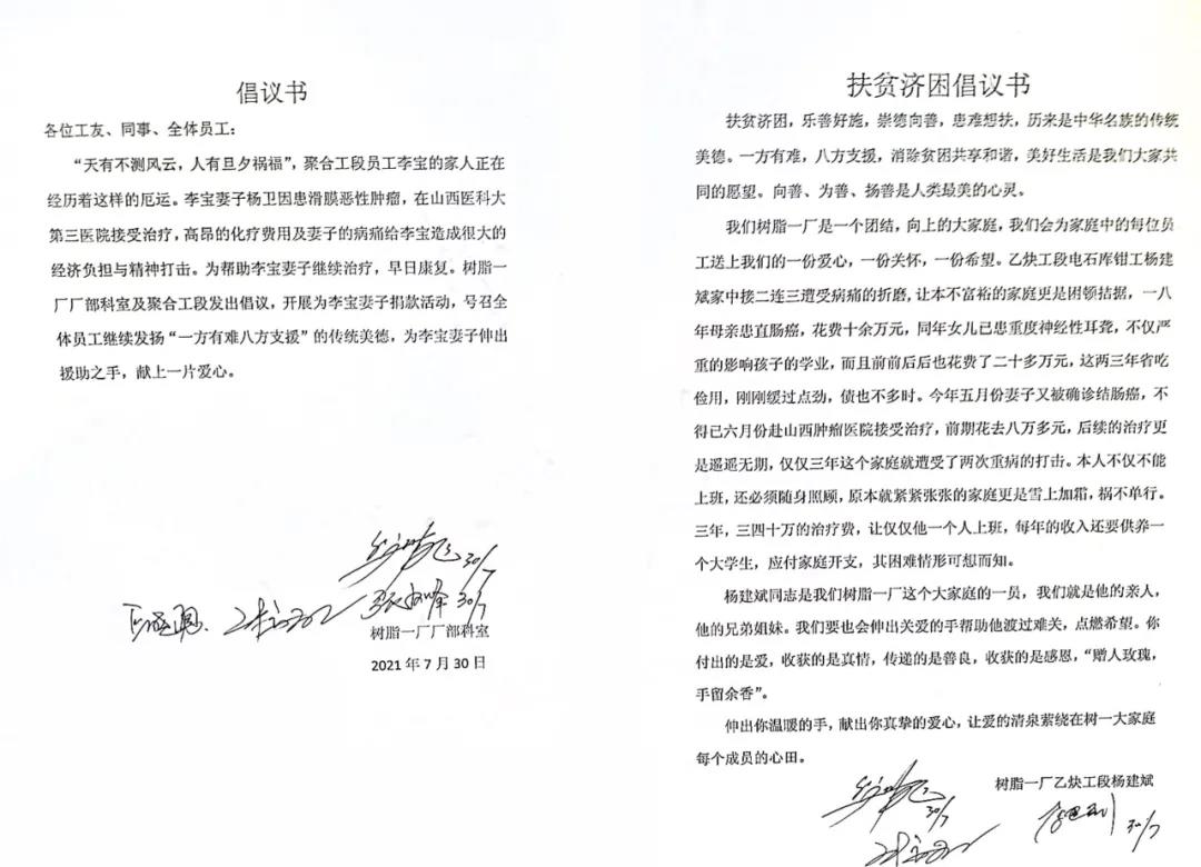 在得知情況后,樹脂一廠領(lǐng)導(dǎo)高度重視,第一時(shí)間研究決定,向全體員工發(fā)出“愛心捐款倡議書”,立即得到了全體干部員工的響應(yīng)。大家慷慨解囊,紛紛向楊建斌之妻和李寶之妻伸出援助之手。短短幾天的募捐,共募捐到19565元贈(zèng)予楊建斌、18325元贈(zèng)予李寶(前期水滴籌員工自發(fā)募捐5030元)。