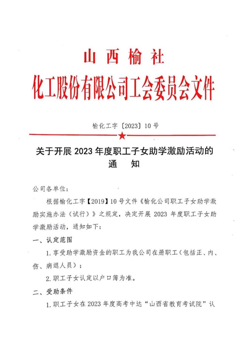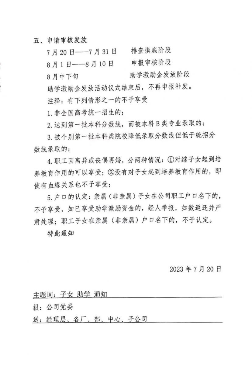 7月20日,隨著各高校錄取通知書陸續(xù)發(fā)放,公司下發(fā)了《關于開展2023年度職工子女助學激勵活動的通知》,對職工子女助學激勵的認定范圍、受助條件、資助標準、申報程序等進行了詳細說明,2023年度職工子女助學激勵活動正式開始。