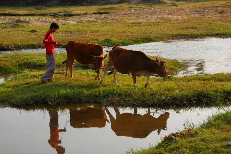 在我關(guān)于牛的記憶中還有一個(gè)非常特殊的橋段,我家喂養(yǎng)的那頭母牛每隔一兩年便會(huì)生下一個(gè)小牛犢(大部分小牛養(yǎng)個(gè)一年半載的就會(huì)被賣(mài)掉補(bǔ)貼家用),期間曾有一個(gè)小牛犢是在我小學(xué)放暑假期間生的,當(dāng)時(shí)閑著無(wú)事的我,幾乎每天一有時(shí)間就跑去看這頭全身棕紅的小牛,很快就和它建立起了無(wú)比親密的關(guān)系。盛夏期間,我最?lèi)?ài)去村東頭的河里游泳摸魚(yú),在這條小河邊,有我的歡樂(lè),也有這頭小牛的歡樂(lè)。每當(dāng)我要去河邊玩耍時(shí),這頭小牛就會(huì)搖頭晃腦的緊跟著我,當(dāng)我和伙伴們?cè)诤永镒栽诘挠斡炬覒驎r(shí),小牛則在岸邊的草灘上往來(lái)飛奔,待我玩累上岸時(shí),它又蹦跳著用它那光禿禿的腦袋冷不丁的把我頂入河中,然后揚(yáng)起尾巴一溜煙跑遠(yuǎn)了,常常惹得和我一起的小伙伴們哈哈大笑又艷羨不已。在我的堅(jiān)持下,這頭小牛在我家足足待了三年有余,后來(lái)由于父親腿疼的厲害,不得不將大牛和小牛一塊賣(mài)掉了,為此我曾傷心了好長(zhǎng)一段時(shí)間。