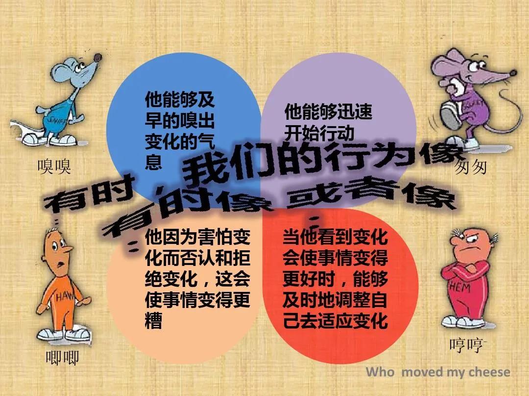 前兩年也曾讀過《誰動了我的奶酪》這本書,沒什么印象,如今重拾,又處在這樣的大環(huán)境,感觸頗深,也許與經(jīng)歷、與人生、與年齡、與環(huán)境都有關系,而立之年,過于安逸,當生活突變時,我們危機感如此強烈,思前想后,顧東顧西,現(xiàn)在的我就像書中的“唧唧”,當改變來臨,我們依然希望有天會回到原來的模樣,畏首畏尾,不敢去開始新的征程,新的挑戰(zhàn)。相比,兩只小老鼠善于觀察,思維敏銳,掛在脖子上的鞋子就是最好的準備,及時調整,迅速行動,沒有思想包袱,輕松上陣,很快也就到達新的奶酪站。