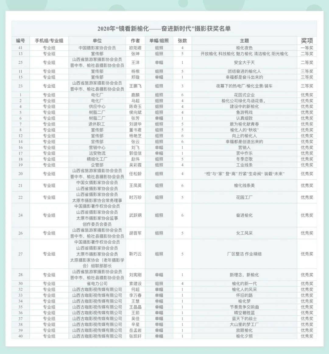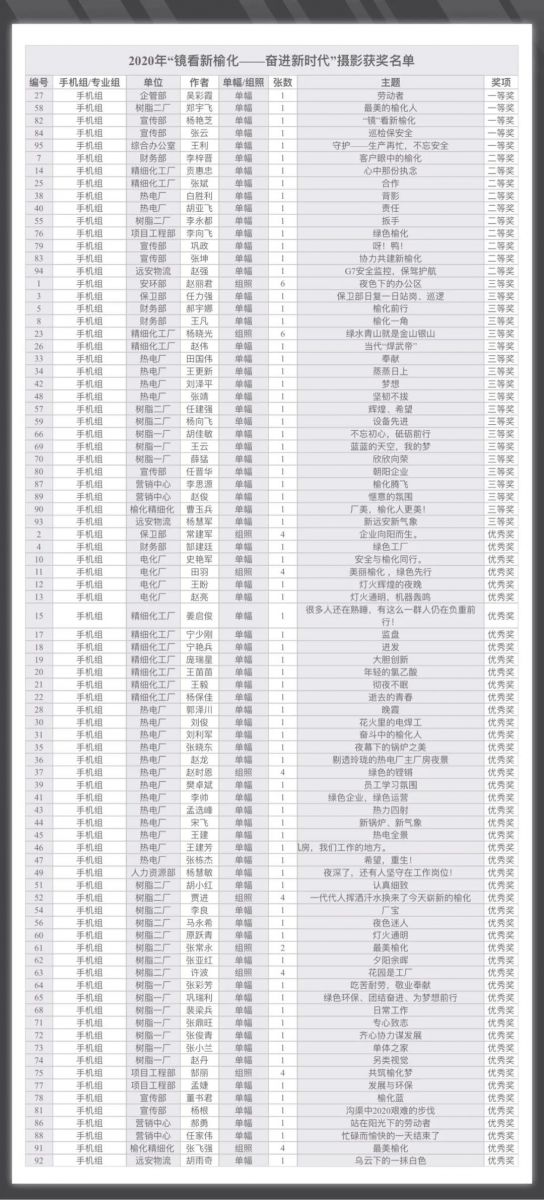 11月12日,榆化公司“鏡看新榆化——奮進(jìn)新時(shí)代”攝影大賽順利完成作品審核評(píng)選,選出了相機(jī)組和手機(jī)組一等獎(jiǎng)、二等獎(jiǎng)、三等獎(jiǎng)、優(yōu) 秀獎(jiǎng)的全部獎(jiǎng)項(xiàng)。