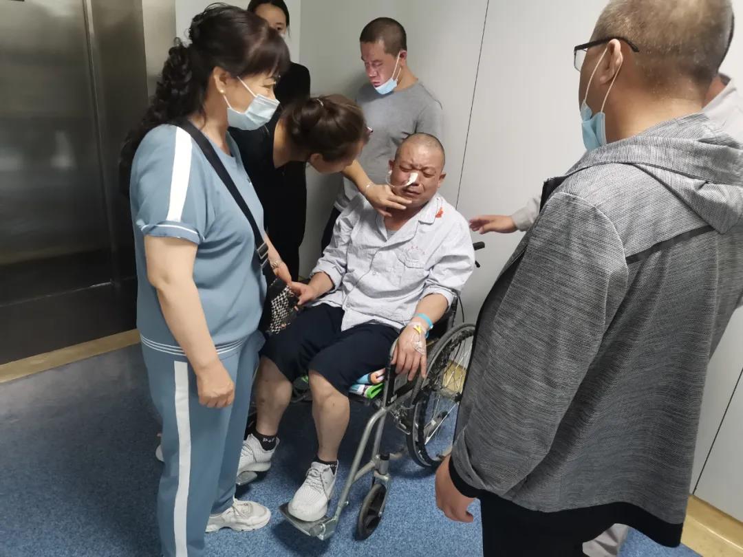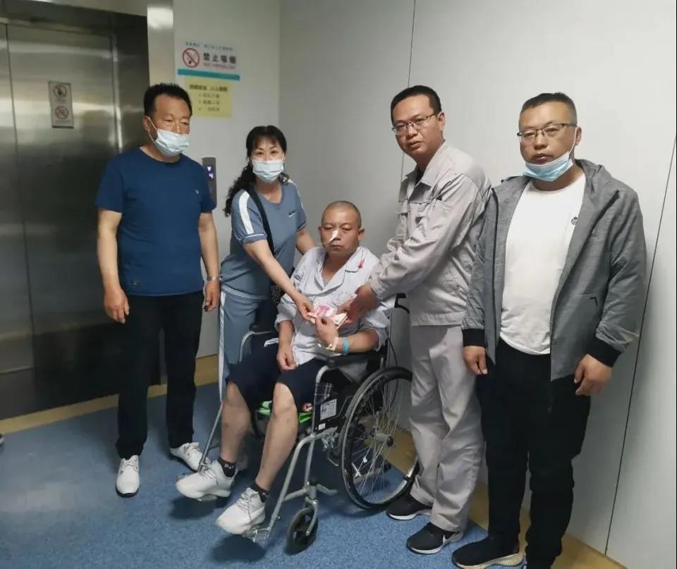 在醫(yī)院,我們見到了剛做完康復(fù)訓(xùn)練的梁永軍,臉色蒼白的他,鼻孔里插著胃管,左手上密密麻麻的血管已被貼滿了白色膠布,兩眼發(fā)呆靜靜地坐在輪椅上。當(dāng)我們慢慢靠近他時,他便不由自住的留下了眼淚,病痛讓他無法言語。領(lǐng)導(dǎo)們向親屬了解了他最近的病情狀況、醫(yī)療費(fèi)用等問題,并親手將“榆化愛心基金會”的一萬元愛心及時救助金送到他的手中。臨行前囑咐他“安心養(yǎng)病,聽醫(yī)生安排,堅持鍛煉,及早康復(fù),早日回歸崗位。”不會說話的他,只能用眼神傳遞著他的情感,不停的點(diǎn)頭,似有話說卻只能蹦出個“咿咿呀呀”。他的家人們表示非常感謝公司的關(guān)心,為這個不堪重負(fù)的家庭雪中送炭。