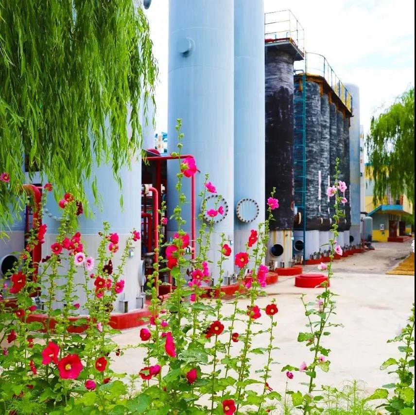 歌曲《聲聲慢》中描繪的美景“青磚伴瓦漆,白馬踏新泥,山花蕉葉暮色叢染紅巾”與盛夏中的樹脂二廠所呈現(xiàn)出來的美景有異曲同工之妙。試想,走在小雨打濕的青磚鋪就的廠區(qū)道路上,紅白相間的路沿石顯得格外亮眼,看著道路兩旁造型新穎的各式景致和精美的盆栽,廠區(qū)綠化帶內(nèi)的樹木郁郁蔥蔥、各色鮮花點綴在其中,一陣清風吹過,花瓣輕沾衣襟、花香撲面而來,此時的你又怎能不慢下腳步,去用心感受一下這如詩如畫的美好畫卷呢?