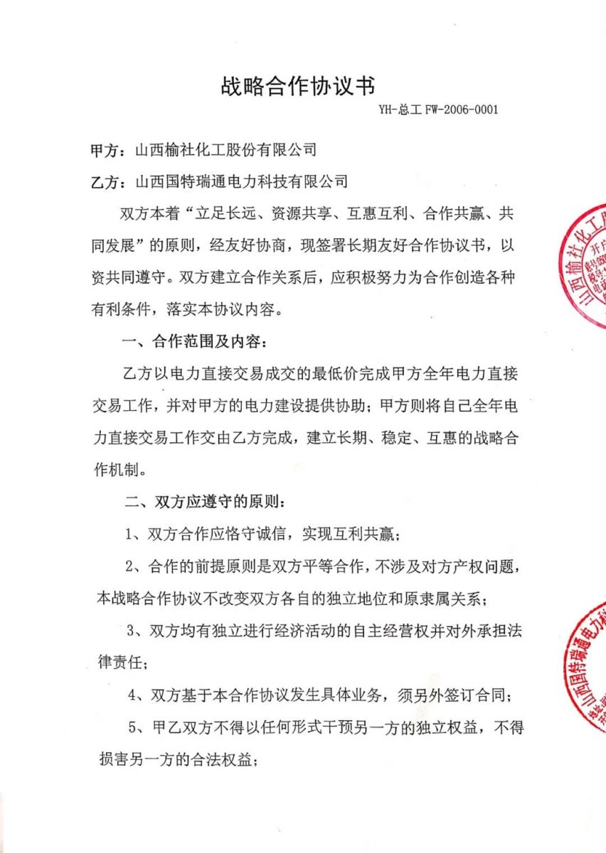 合約的主要內(nèi)容為山西國特瑞通電力科技有限公司以電力直接交易成交的最低價完成我公司全年電力直接交易工作,并對我公司的電力建設提供協(xié)助;我公司則將自己全年電力直接交易工作交由山西國特瑞通電力科技有限公司,建立長期、穩(wěn)定、互惠的戰(zhàn)略合作機制。