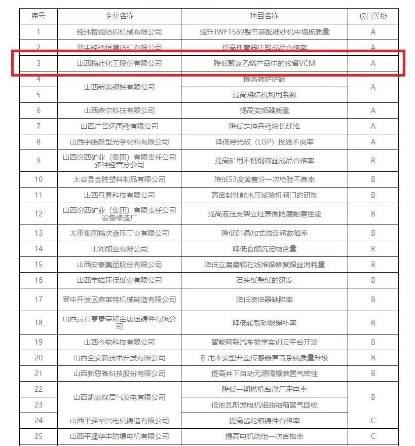 近日,2021年度晉中市質(zhì)量攻關(guān)項(xiàng)目名單揭曉。公司“降低聚氯乙烯產(chǎn)品中的殘留VCM”質(zhì)量攻關(guān)項(xiàng)目獲得A類優(yōu)異成績(jī)。