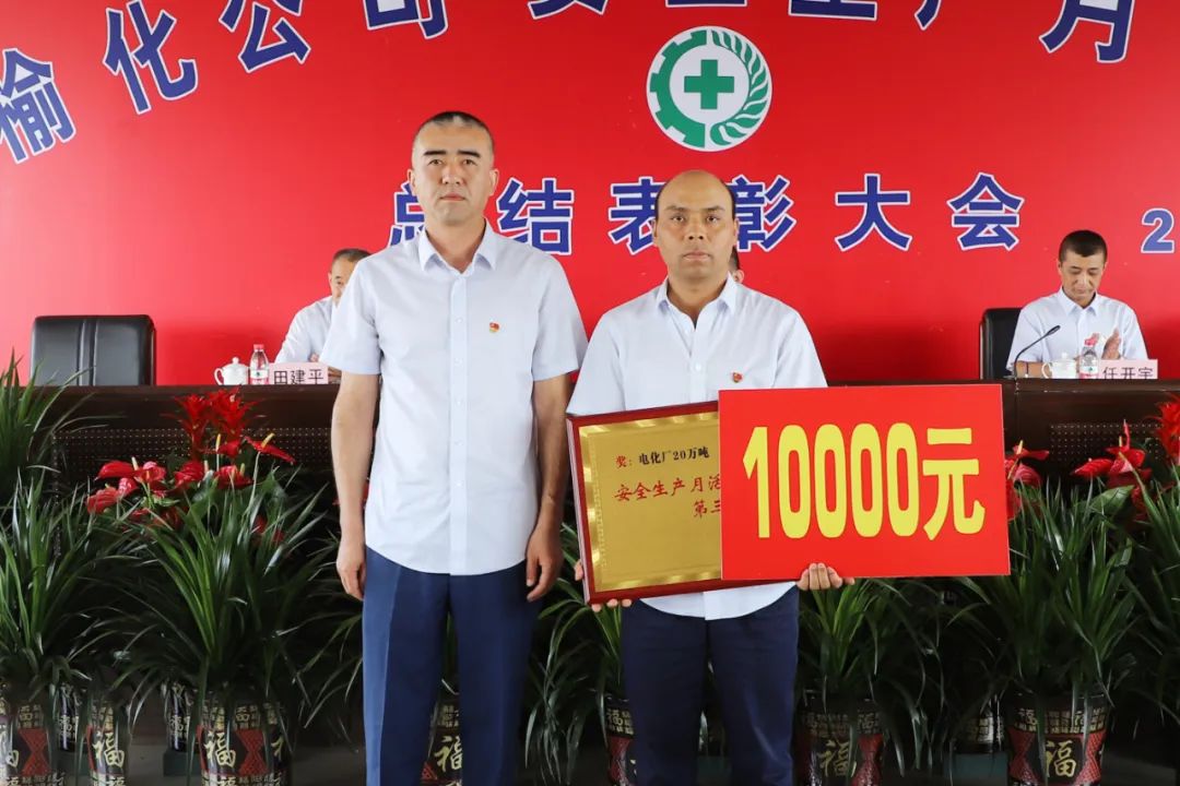 副總經(jīng)理常曉飛為獲得“安全生產(chǎn)月”活動綜合排名第三名的電化廠20萬噸頒獎