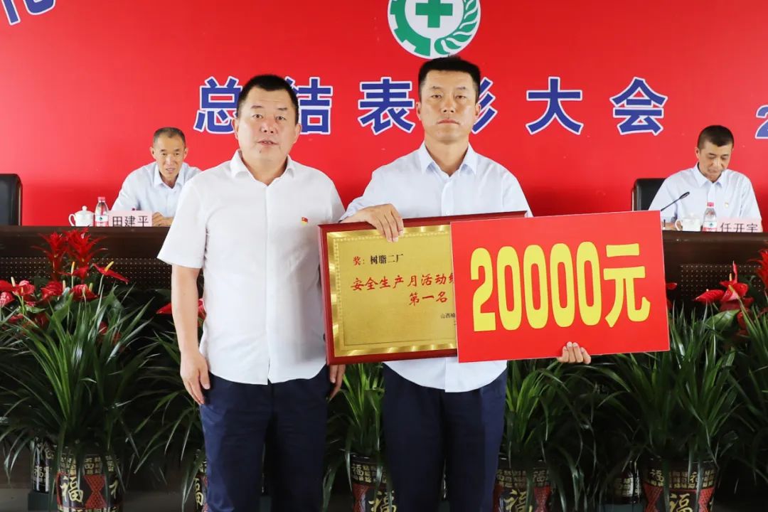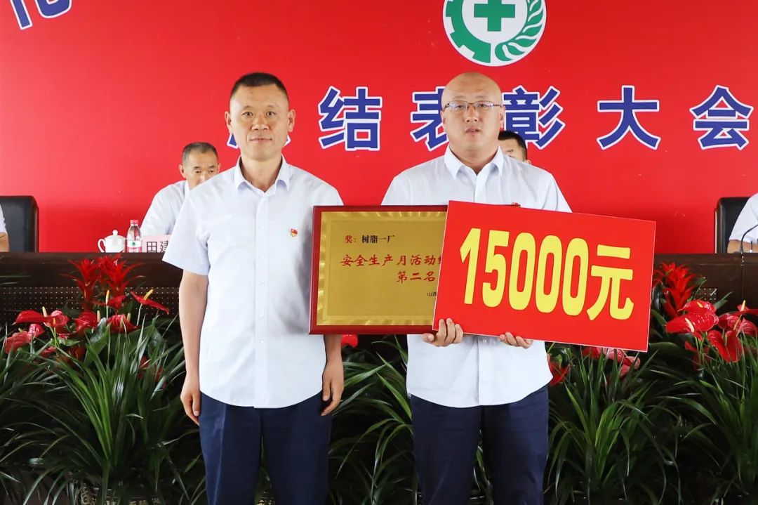 副總經(jīng)理劉洋為獲得“安全生產(chǎn)月”活動綜合排名第二名的樹脂一廠頒獎