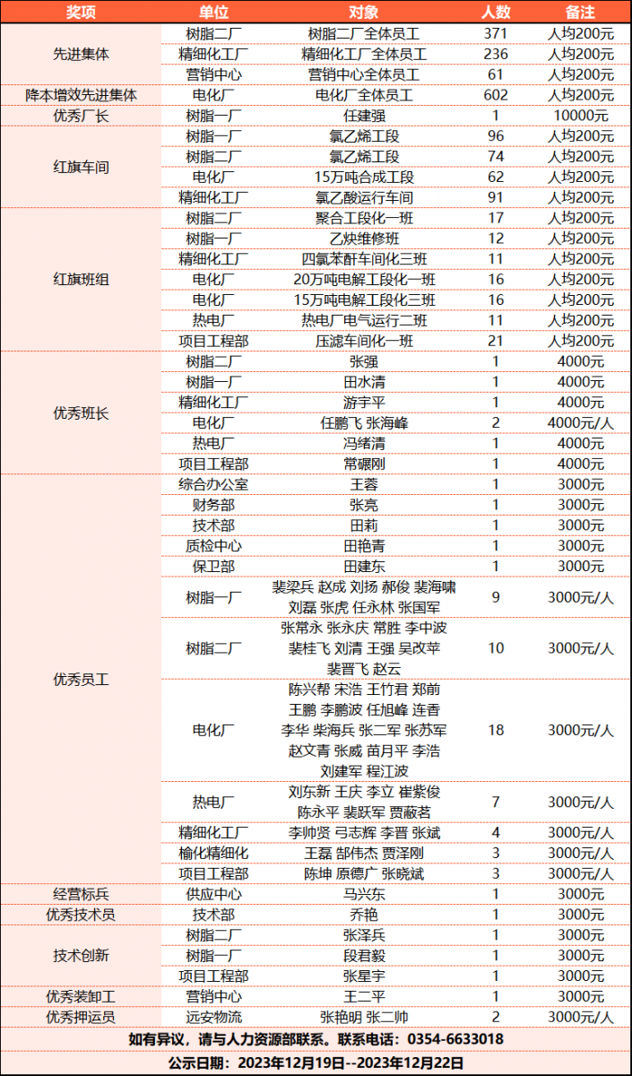 依據(jù)《榆化公司2023年度表彰獎勵的通知》要求,結(jié)合各單位推選出的先進(jìn)個人,2023年度共評選出先進(jìn)集體3個、降本增效先進(jìn)集體1個、優(yōu)秀廠長1名、紅旗車間4個、紅旗班組7個、優(yōu)秀班長7名、優(yōu)秀員工59名、經(jīng)營標(biāo)兵1名、優(yōu)秀技術(shù)員1名、技術(shù)創(chuàng)新3名、優(yōu)秀裝卸工1名、優(yōu)秀押運(yùn)員2名。