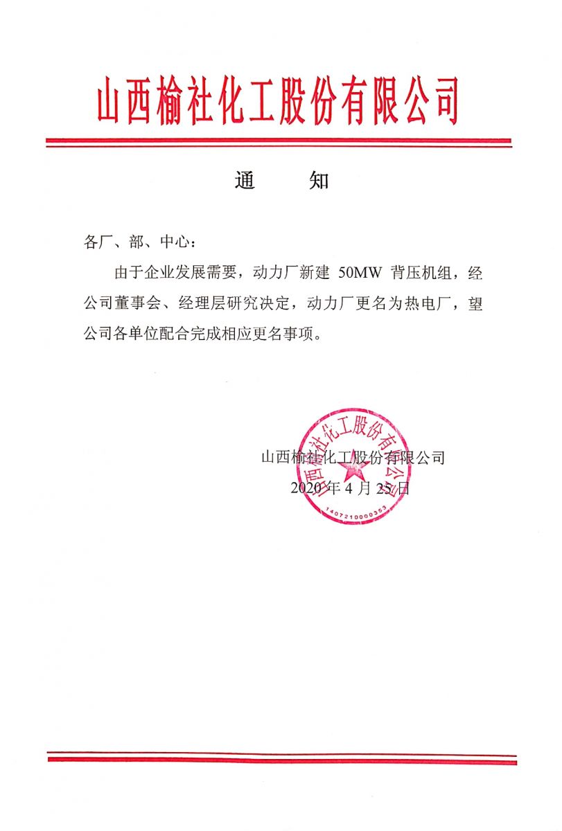 關(guān)于動(dòng)力廠更名為熱電廠的通知