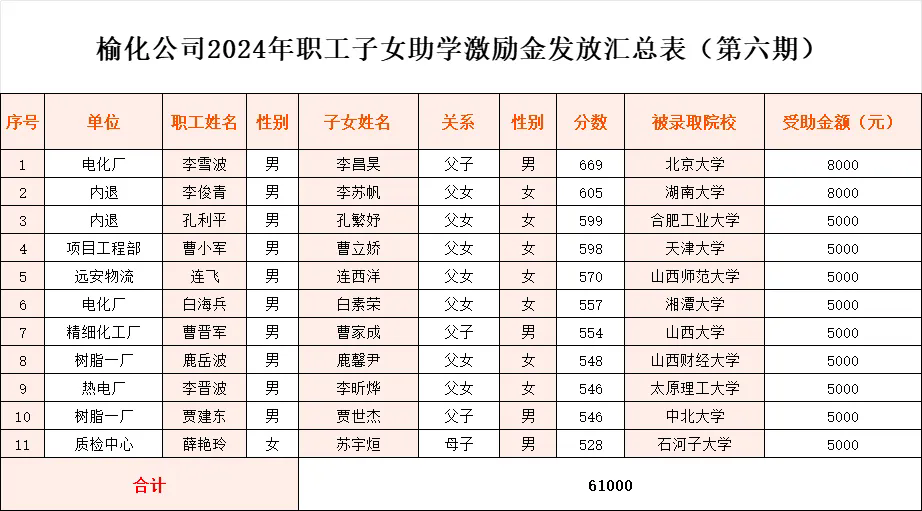 甲辰龍年,榆化子弟高考成績再創(chuàng)佳績。經(jīng)過前期摸底申報(bào)審核,11名榆化子弟符合受助條件,總計(jì)榮獲助學(xué)激勵金61000元。其中李昌昊同學(xué)更是以669分的驕人成績奪得榆社縣理科狀元,并被北京大學(xué)錄取,他們是父母的驕傲,也是榆化大家庭的自豪。助學(xué)激勵金不僅是對取得優(yōu)異成績的職工子女的激勵,也是對辛勤培育、默默付出的職工的獎勵,更是要引導(dǎo)全體職工重視子女教育、重視學(xué)習(xí)知識,激勵榆化后代勵志勤學(xué)、刻苦磨煉,努力成為社會的有用之才、棟梁之材。