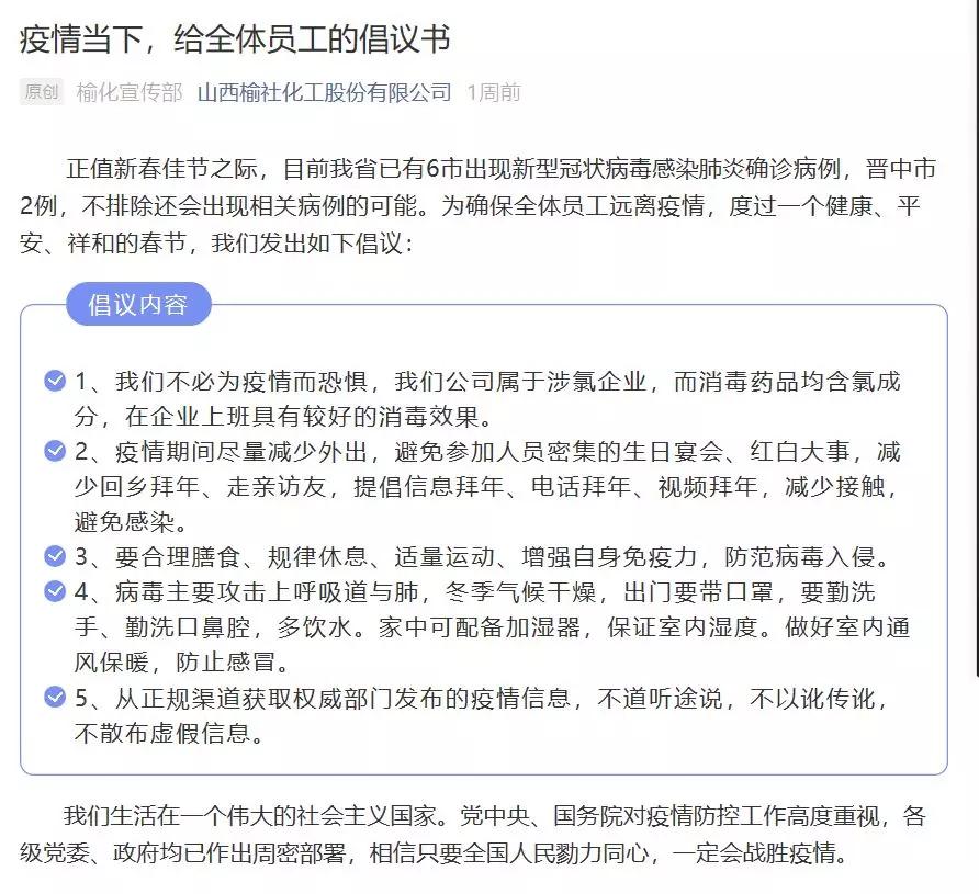 1月26日,公司領導針對疫情防控工作進行專項會議部署,并向全體員工發(fā)出《疫情當下,給全體員工的倡議書》,規(guī)范員工春節(jié)行為,保障員工人身健康。