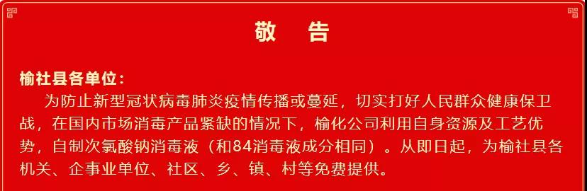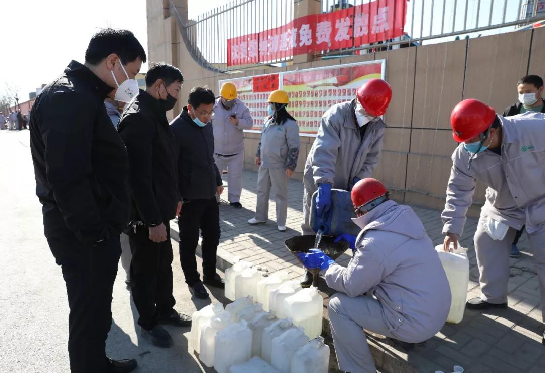 疫情發(fā)生后,公司毅然做出緊急支援縣域公共衛(wèi)生消毒的決定。次氯酸鈉溶液是84消毒液的主要成分,隨著疫情的蔓延,消毒液需求驟增。為防止新型冠狀病毒肺炎疫情傳播或蔓延,切實打好人民群眾健康保衛(wèi)戰(zhàn),在國內(nèi)市場消毒產(chǎn)品緊缺的情況下,榆化公司利用自身資源及工藝優(yōu)勢,自制次氯酸鈉消毒液(和84消毒液成分相同)。自1月31日起,為榆社縣各機關、企事業(yè)單位、社區(qū)、鄉(xiāng)、鎮(zhèn)、村等免費提供,全力保障廣大群眾對消殺用品的需求。