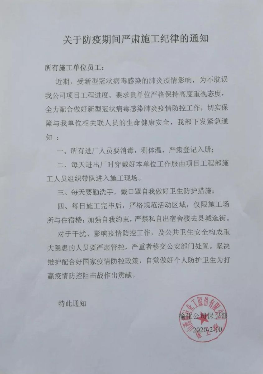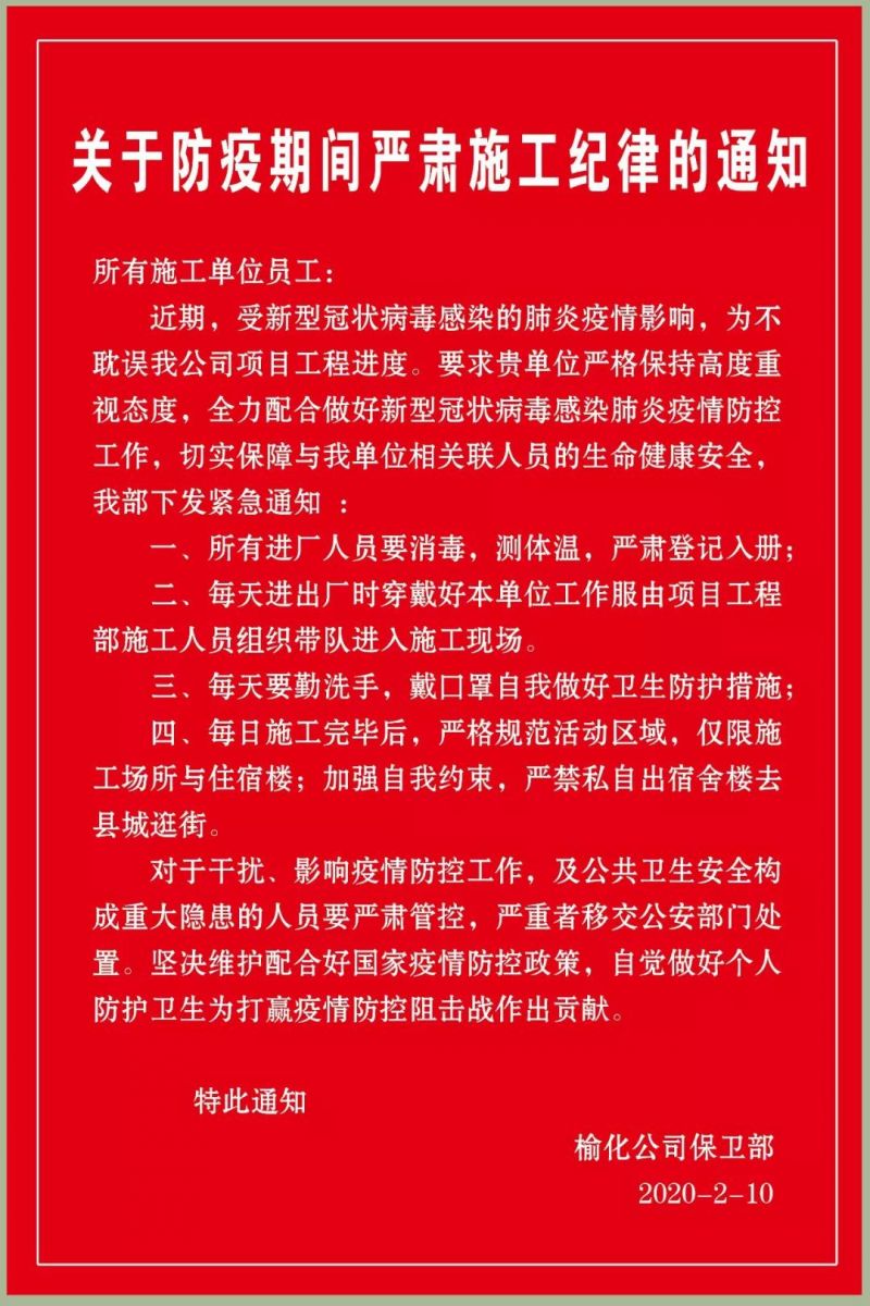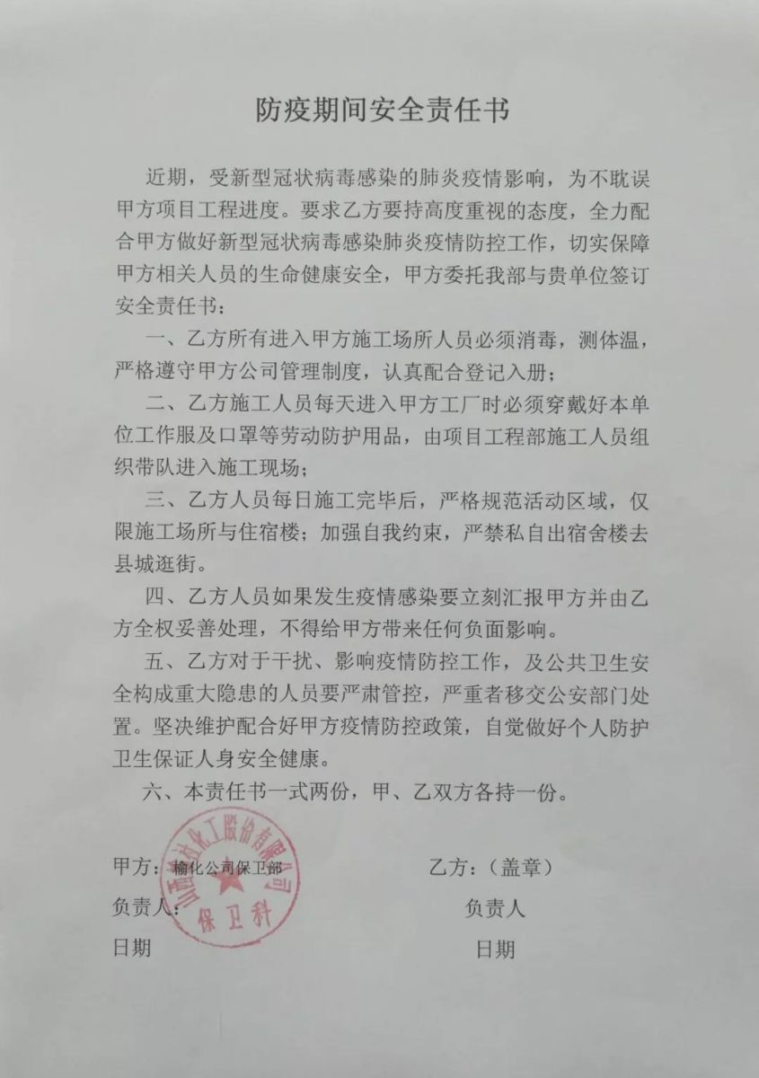 嚴(yán)格管控進入廠區(qū)外來施工人員,最大限度減少人員流動;我公司項目建設(shè)逐步按計劃推進,給公司防疫工作帶來難度,保衛(wèi)部迅速向施工單位下發(fā)緊急通知,并逐一給施工單位宣講防疫期的工作要求,認(rèn)真與施工單位負(fù)責(zé)人簽定安全責(zé)任書;同時在施工單位住宿區(qū)大門外設(shè)置管理關(guān)卡,專人值守,對外來人員實行管制,進出時必須消毒測體溫,登記備案。