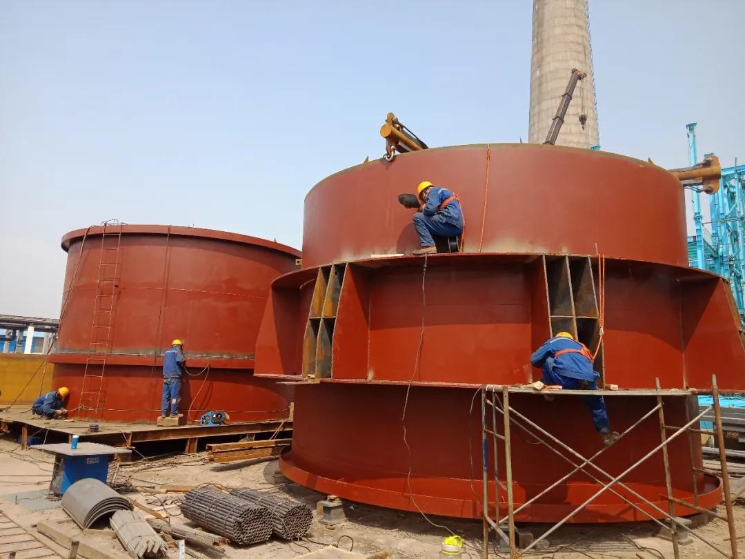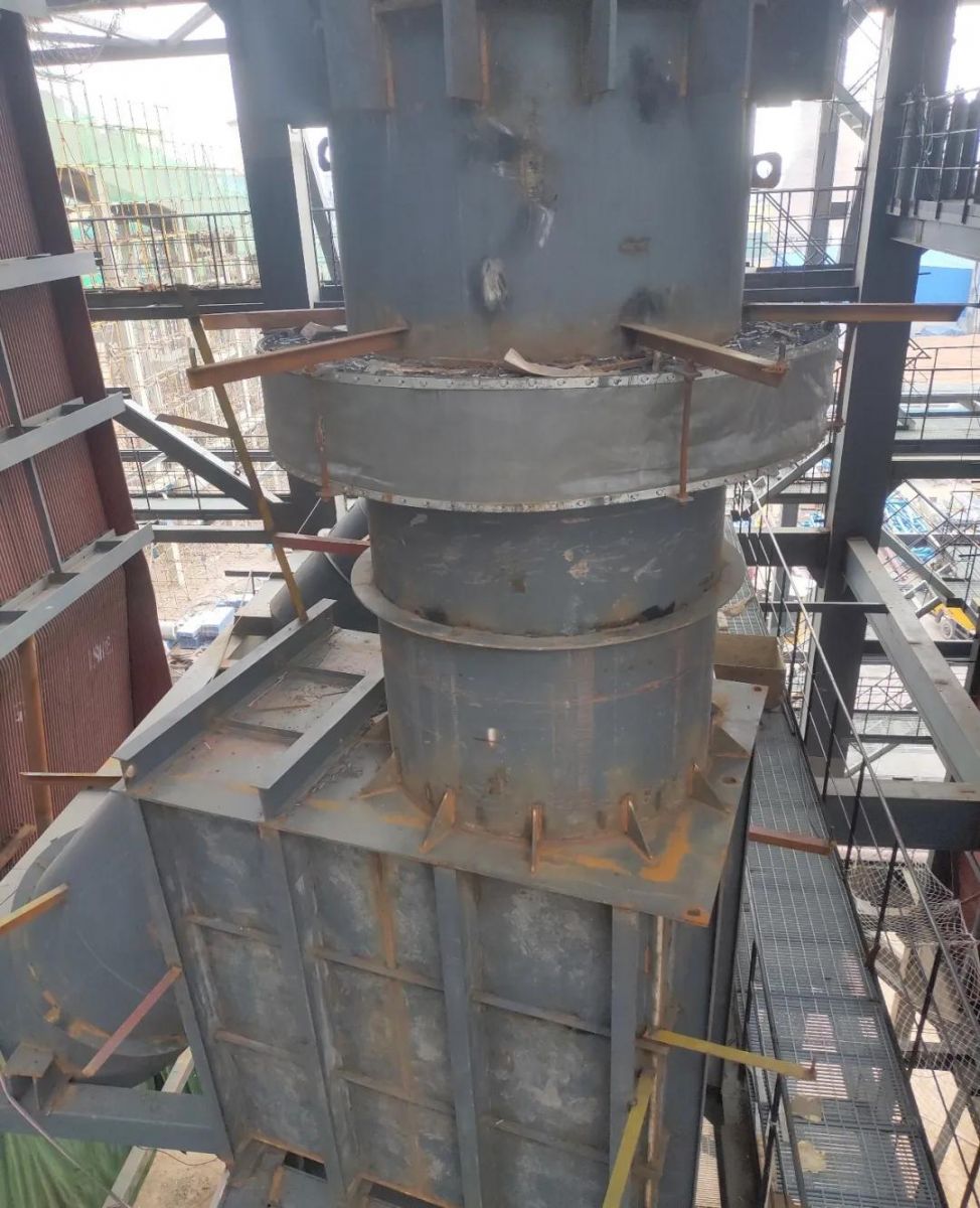 兩臺(tái)返料槽完成,兩臺(tái)旋風(fēng)分離器抓釘正在焊接