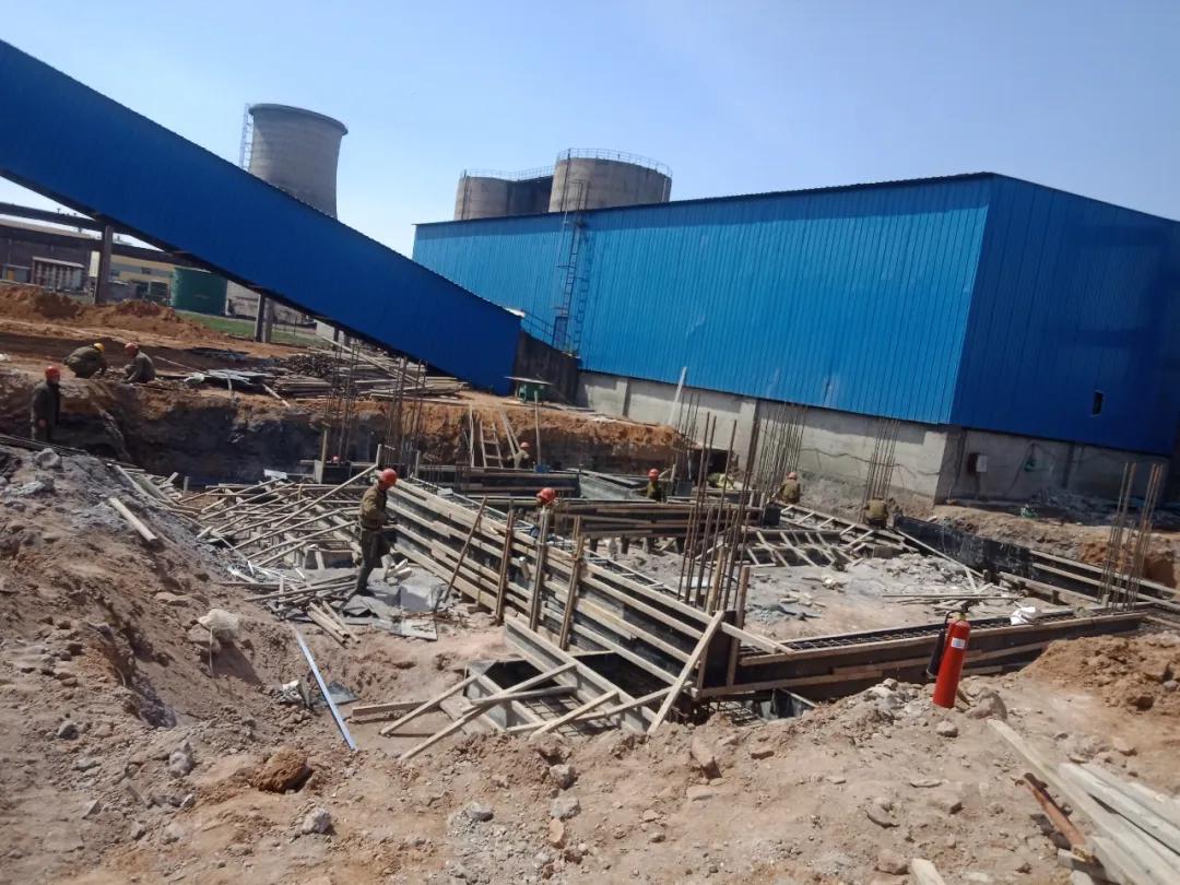 破碎廠房基礎(chǔ)墊層已完,正在綁鋼筋做框架。