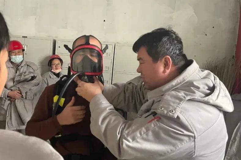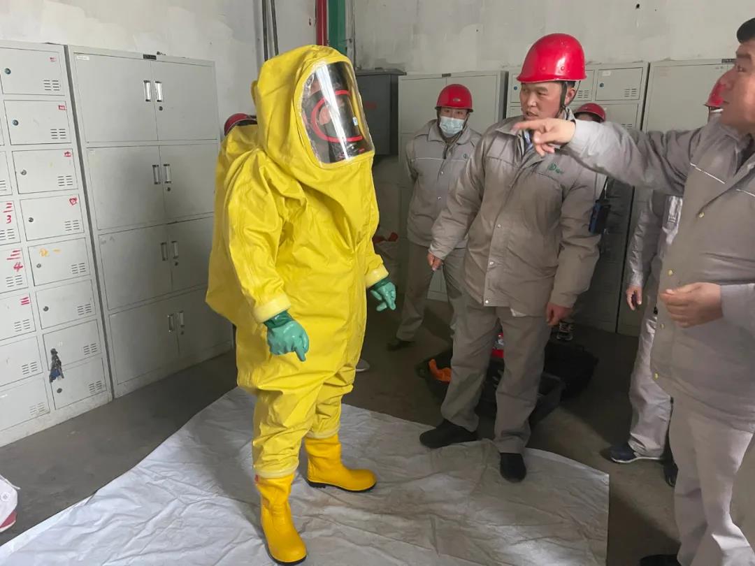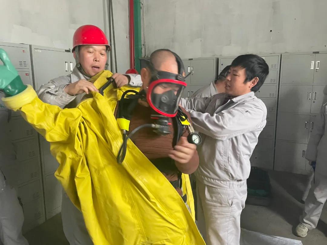 為加強(qiáng)員工應(yīng)對突發(fā)情況的處理能力和對應(yīng)急防護(hù)器材的正確穿戴使用。1月24日上午,電化廠安環(huán)科副科長趙文青及電化廠合成車間副主任曹俊東,利用副班時間,對合成全員進(jìn)行了正壓式空氣呼吸器與重型防化服的佩戴使用培訓(xùn)。